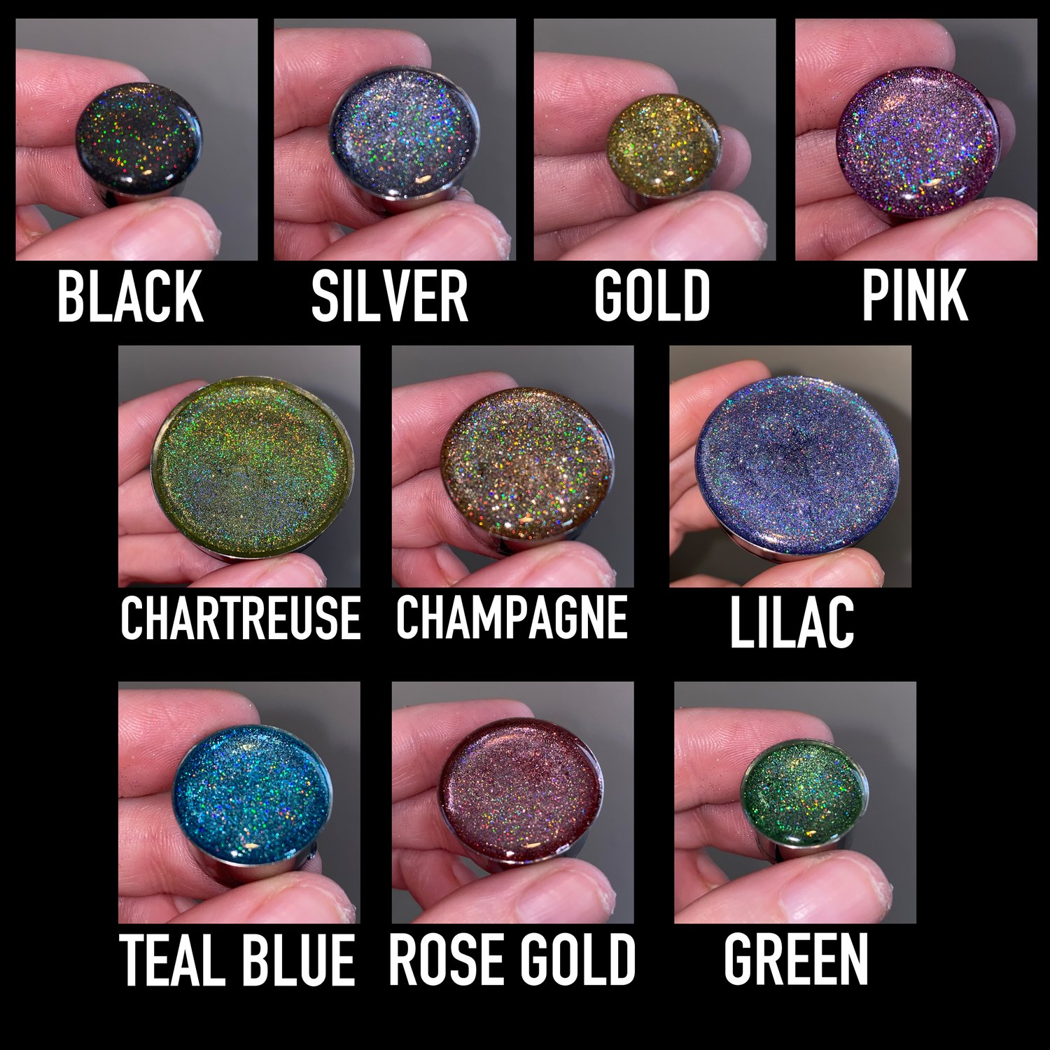 One pair of single flare surgical steel plugs (with o-rings) with a beautiful mega holographic design. This are less glitter and more just in your face holographic! There are ten color options to choose from (shown in the second photo).