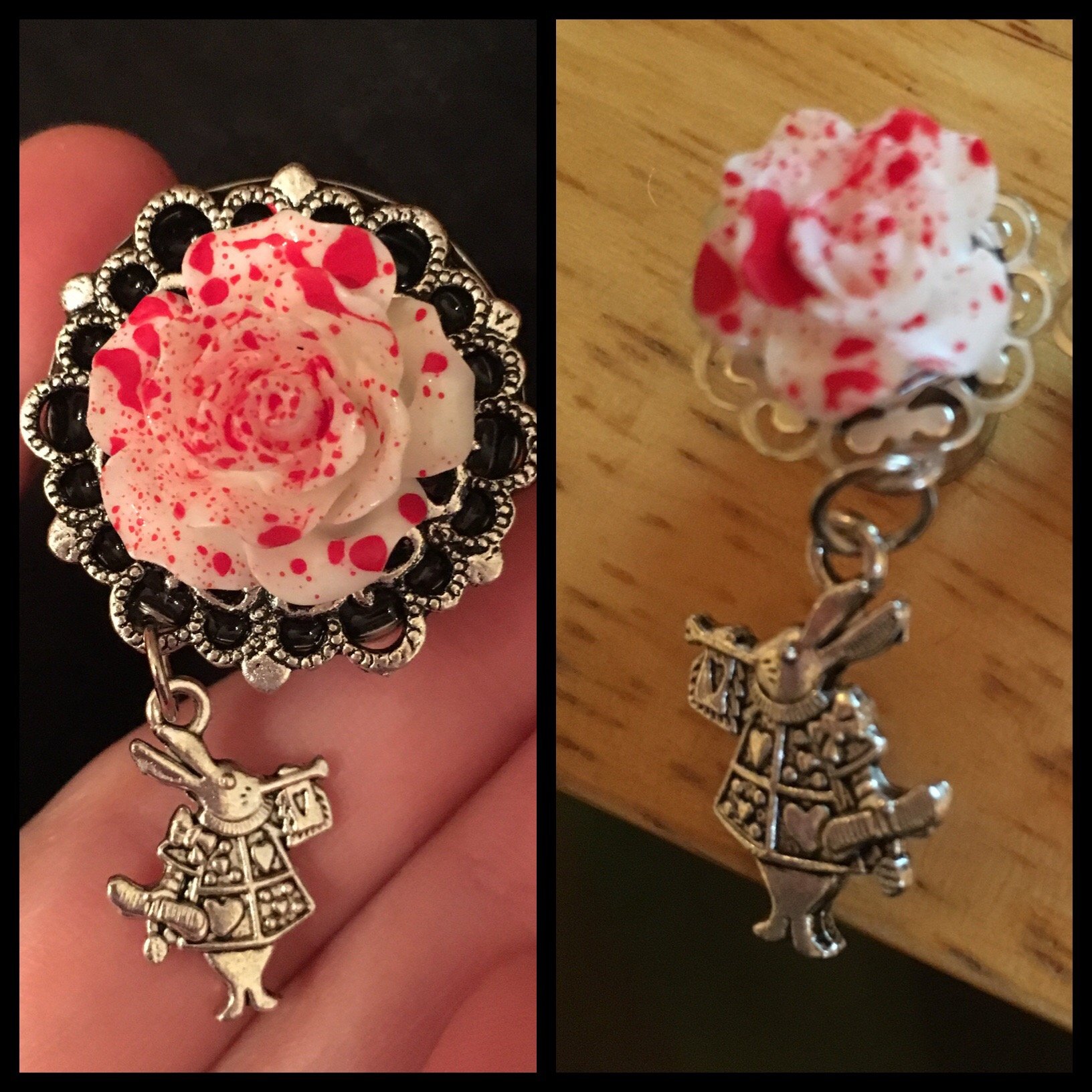 One pair of single flare steel plugs (with o-rings) with a silver base and white rose with red splatter, with a silver Alice in Wonderland themed rabbit dangle. Please note that the silver setting /rose may vary in shape/size depending on the size you order.