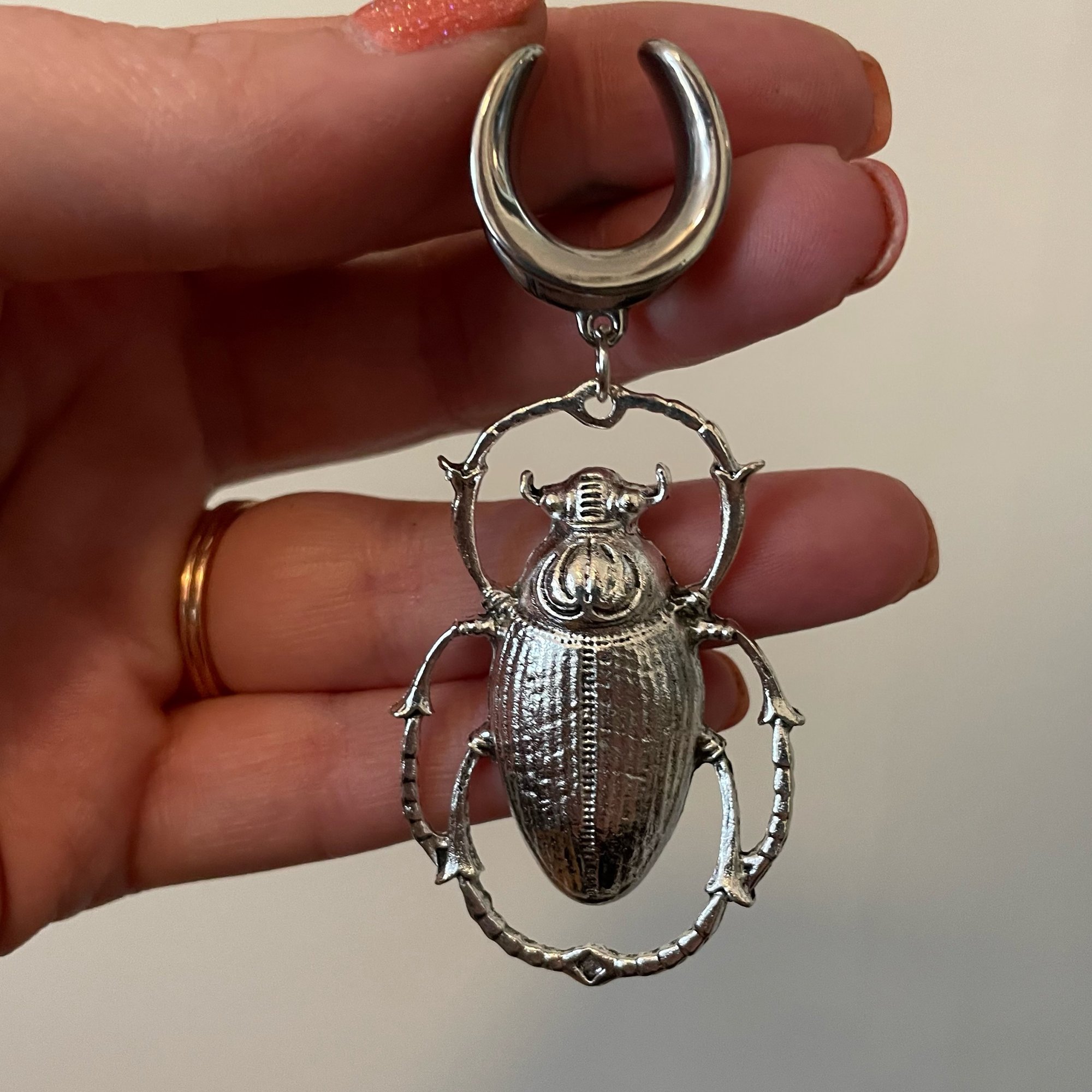 One pair of silver surgical steel saddles with beetle dangle. These will be on the heavier side!