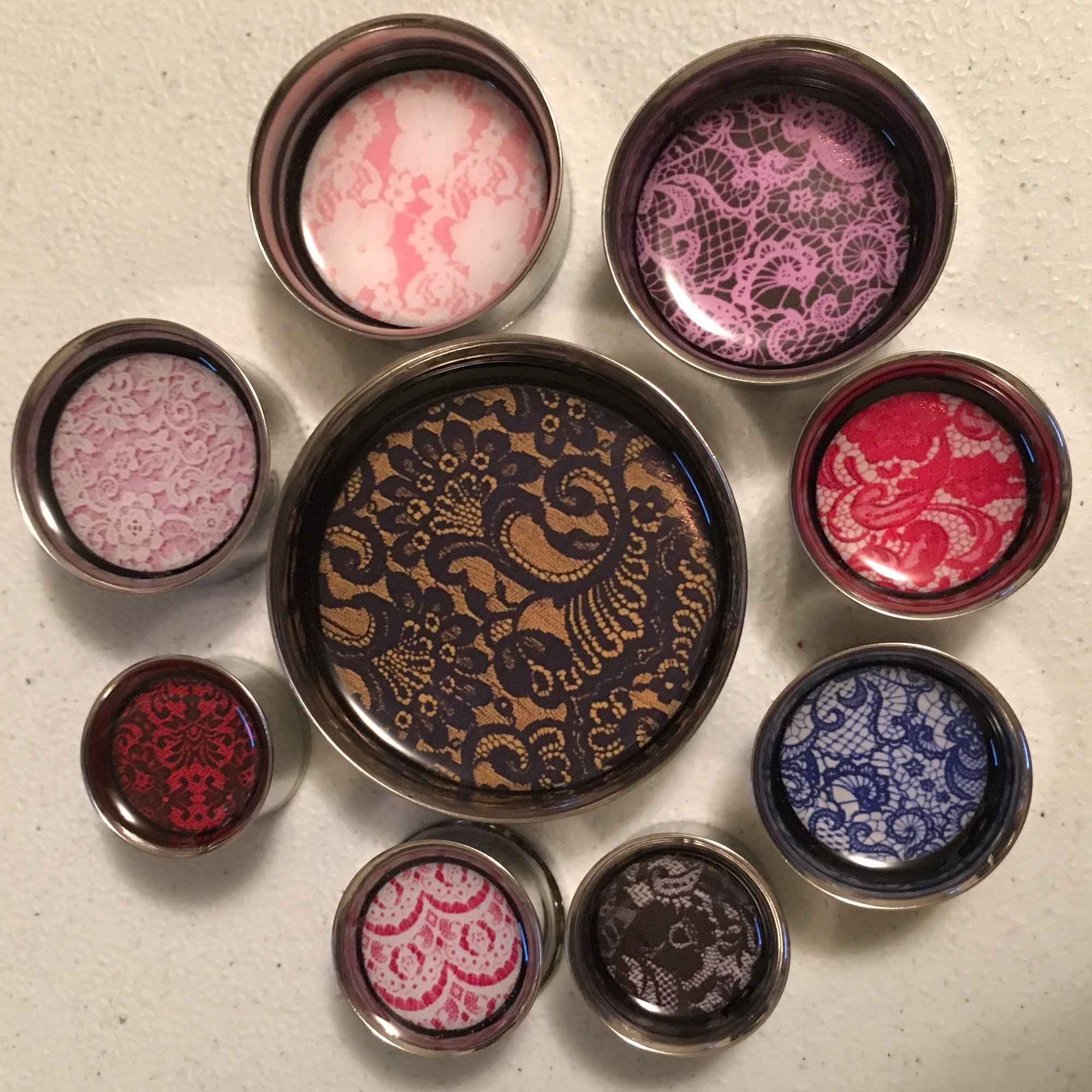 One pair of single flare surgical steel plugs (with o-rings), with a your choice of these twelve lace patterns. Please note for the smaller sizes the bolder colors look best!