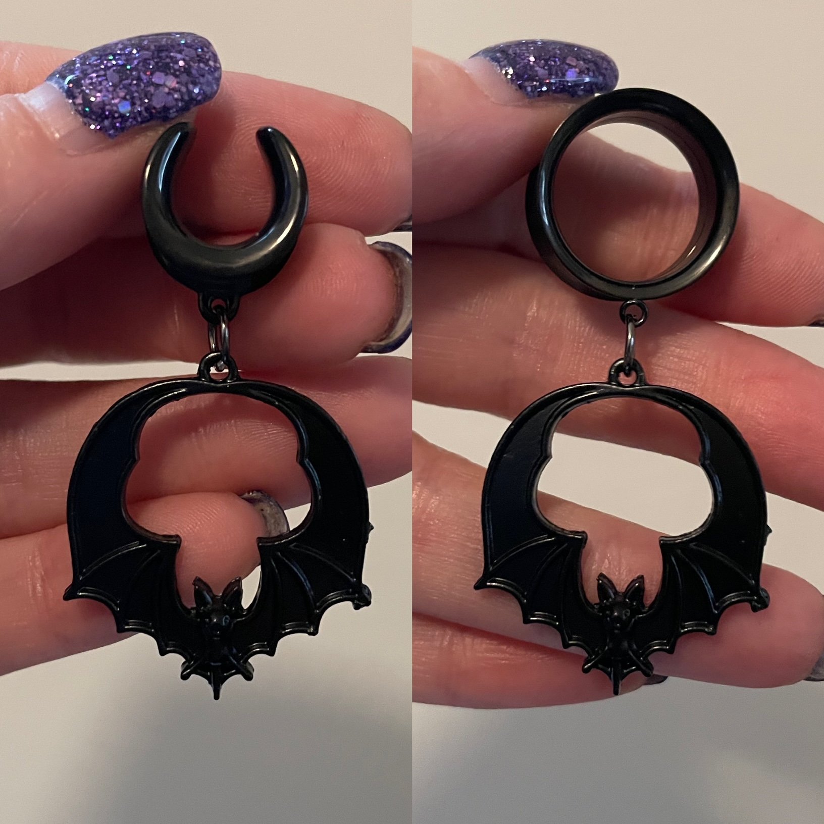One pair of black surgical steel saddles/tunnels with a silver hoop with this very cute bat hoop dangle!