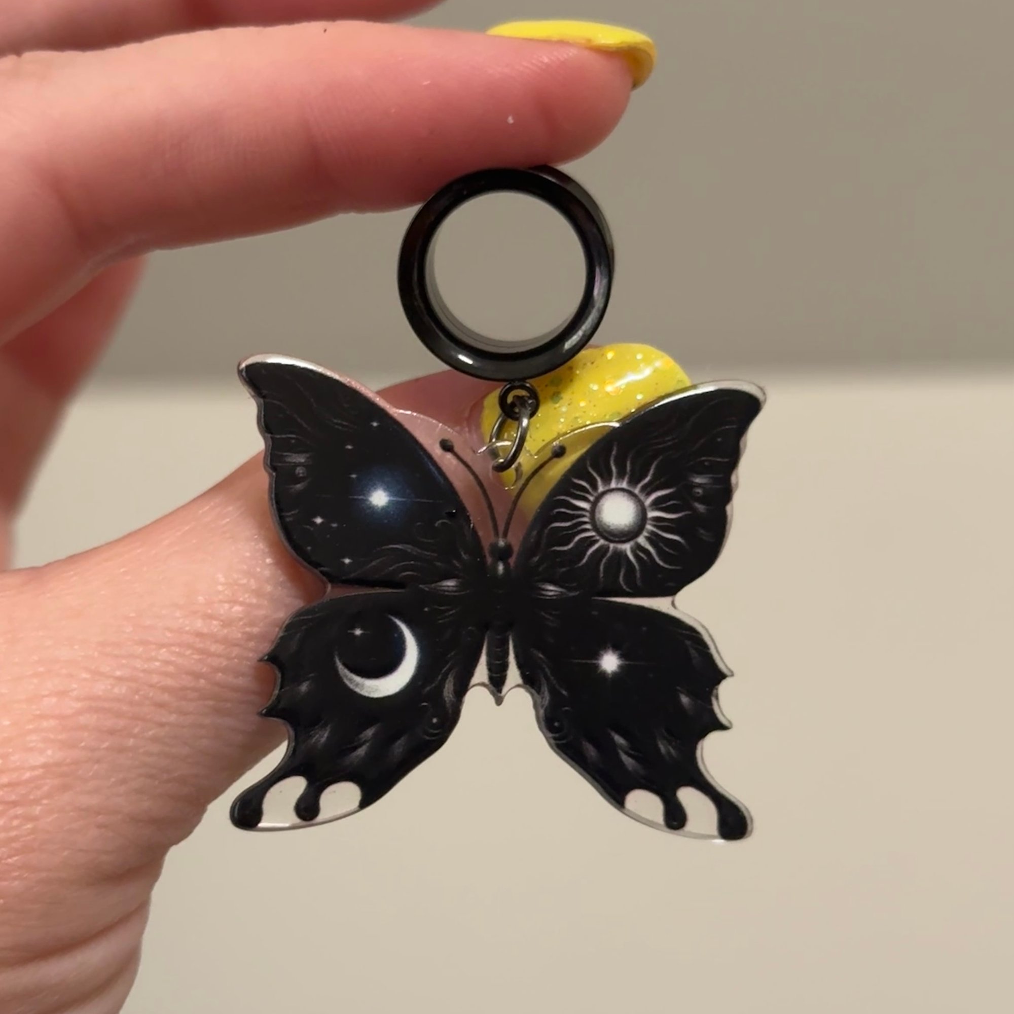 One pair of double flare surgical steel screw back tunnels with this fun celestial butterfly design!