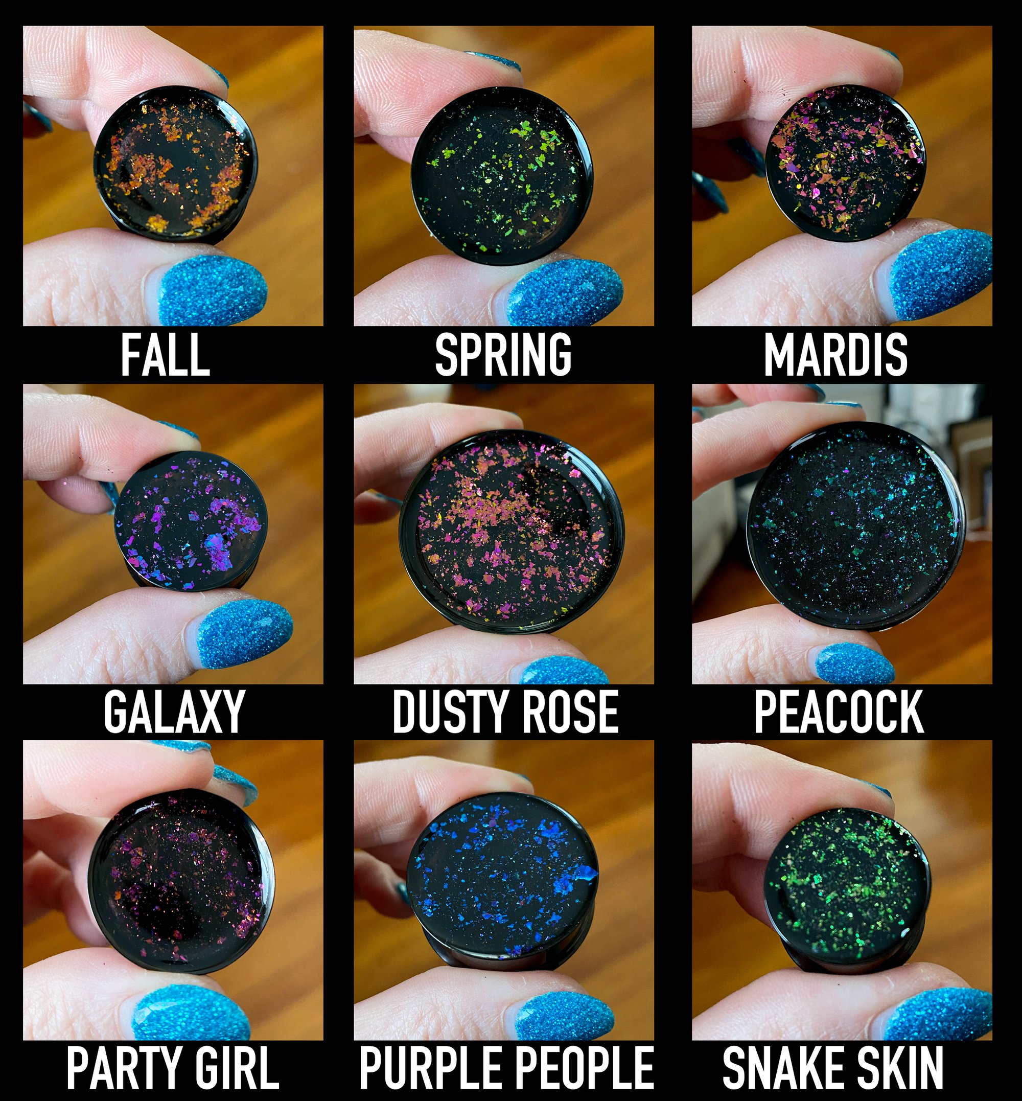 One pair of double flare black surgical steel plugs with your choice of chameleon flake color over a black base inside! Please note that in the smaller sizes the smaller/less flakes there will be. Please leave your flake color choice in a note at checkout!