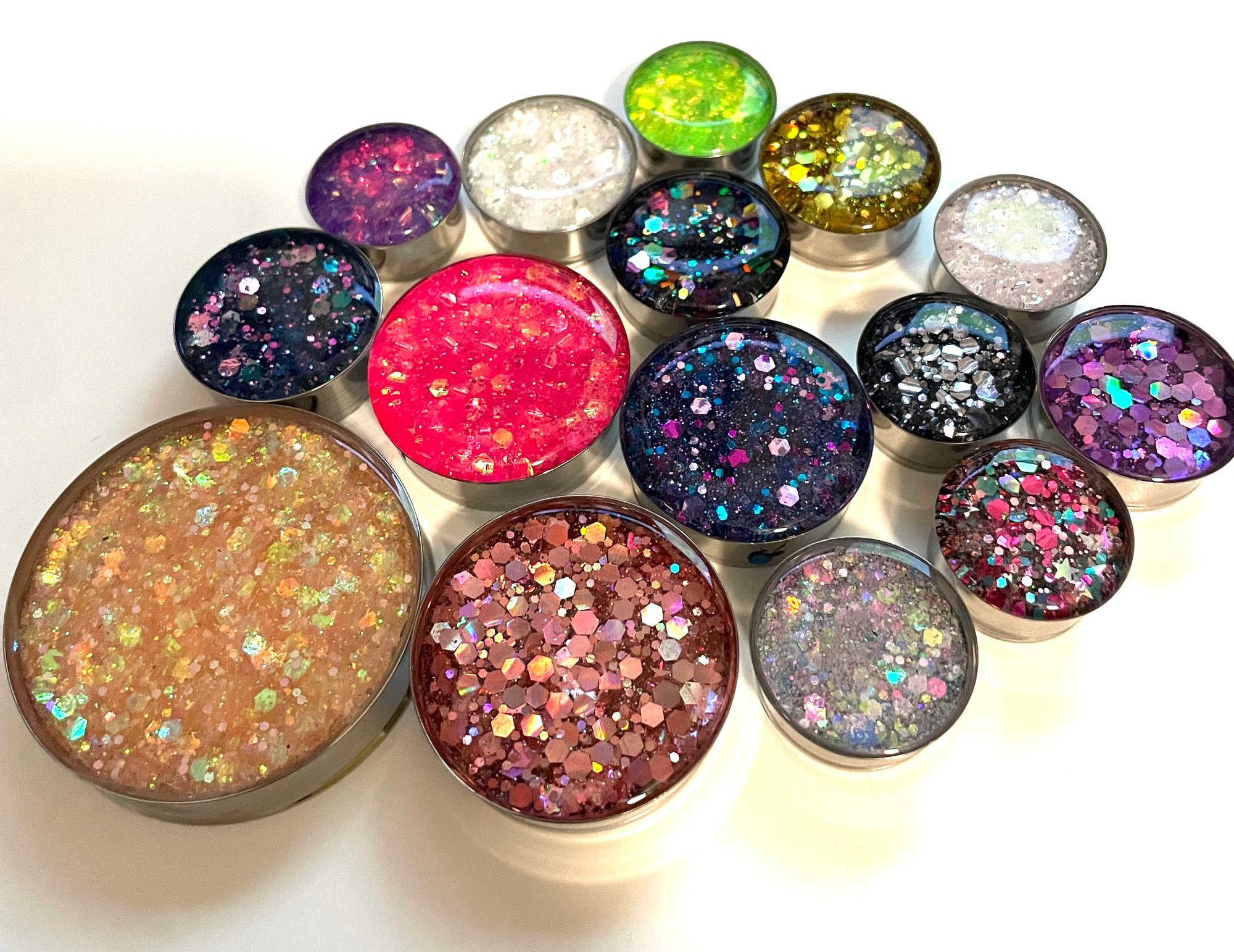 One pair of single flare surgical steel plugs (with o-rings) filled with your choice of chunky glitter!! I currently have 15 different colors which are shown in the product image!