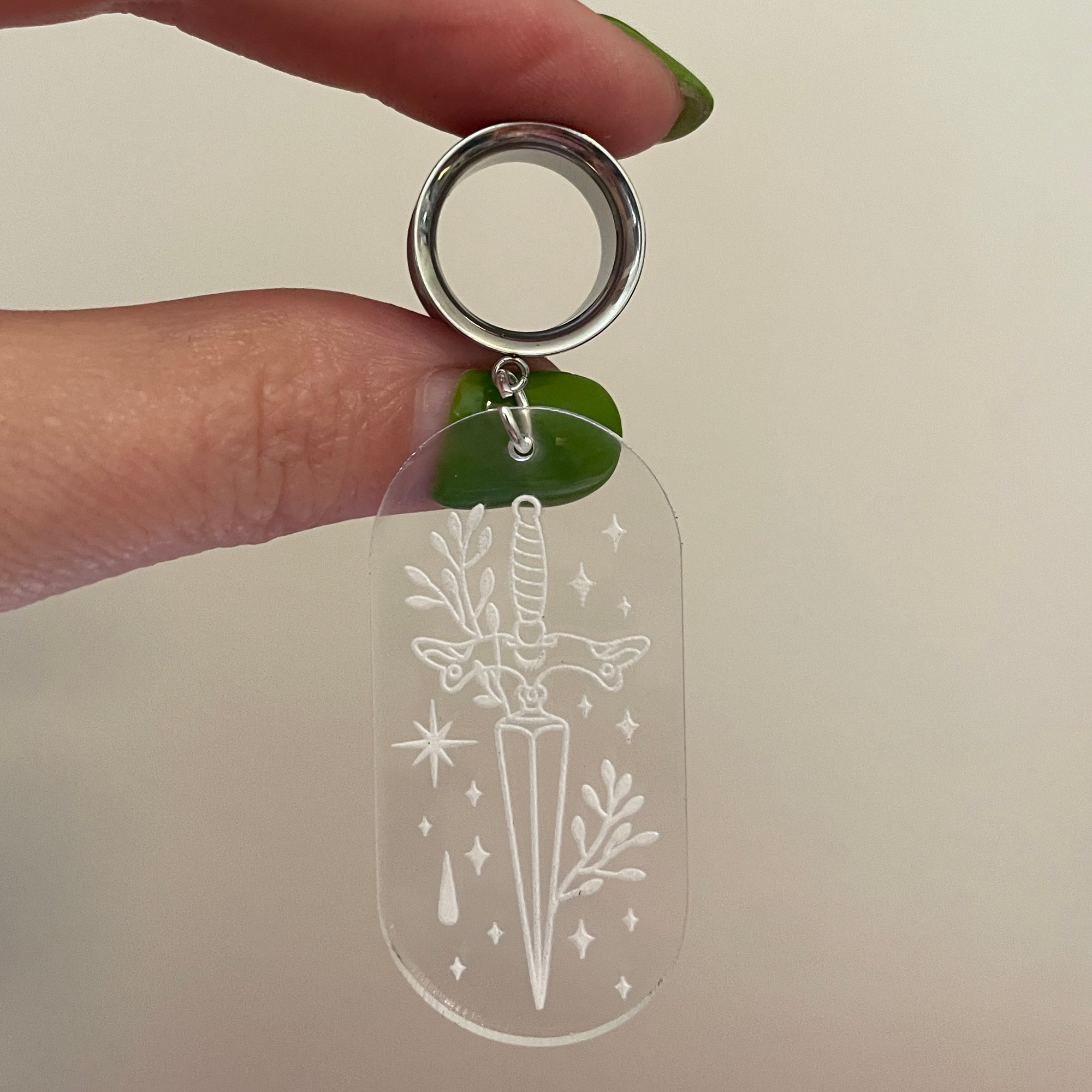 One pair of double flare surgical steel screw back tunnels with this super awesome clear dagger dangle!