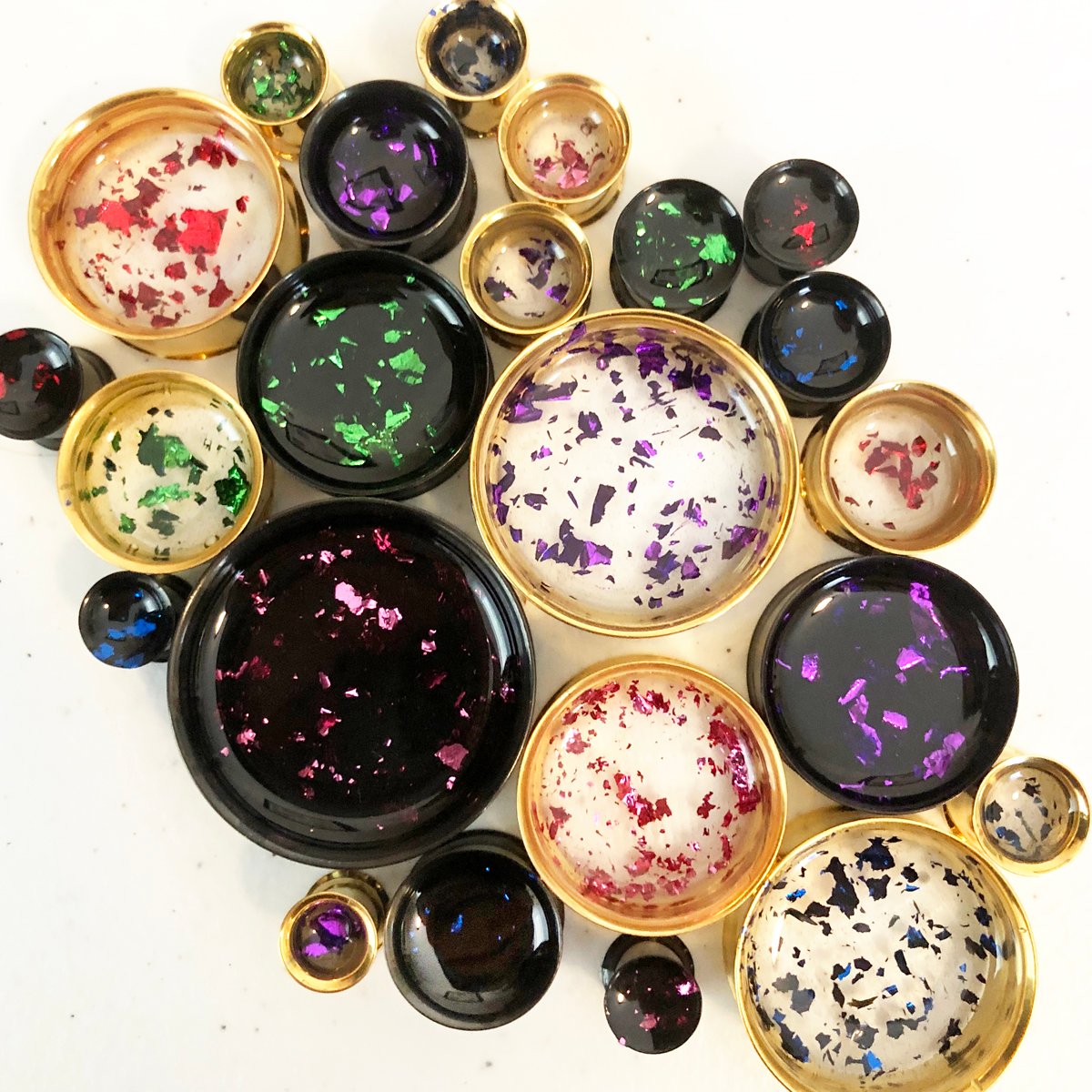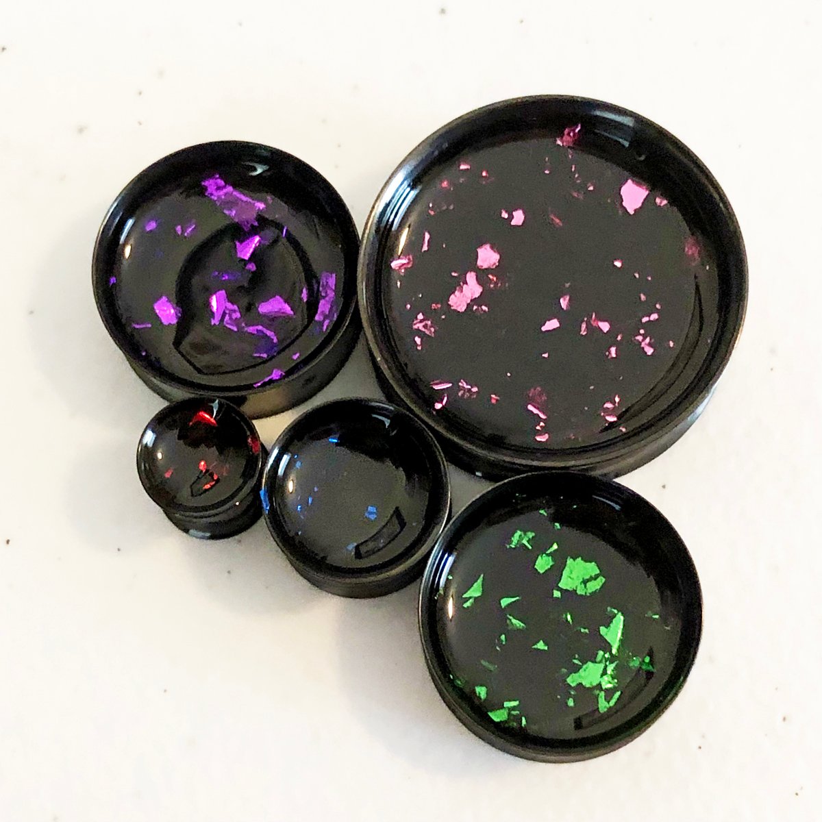 One pair of double flare black surgical steel plugs with a colored metal flake with your choice of either gold tunnels with a clear background or black tunnels with a black background. You can pick your tunnel choice in the dropdown box when ordering. You have five metal flake colors to choose from: red, pink, purple, blue or green! Just let me know which color(s) of flake you'd like in the notes box at checkout!