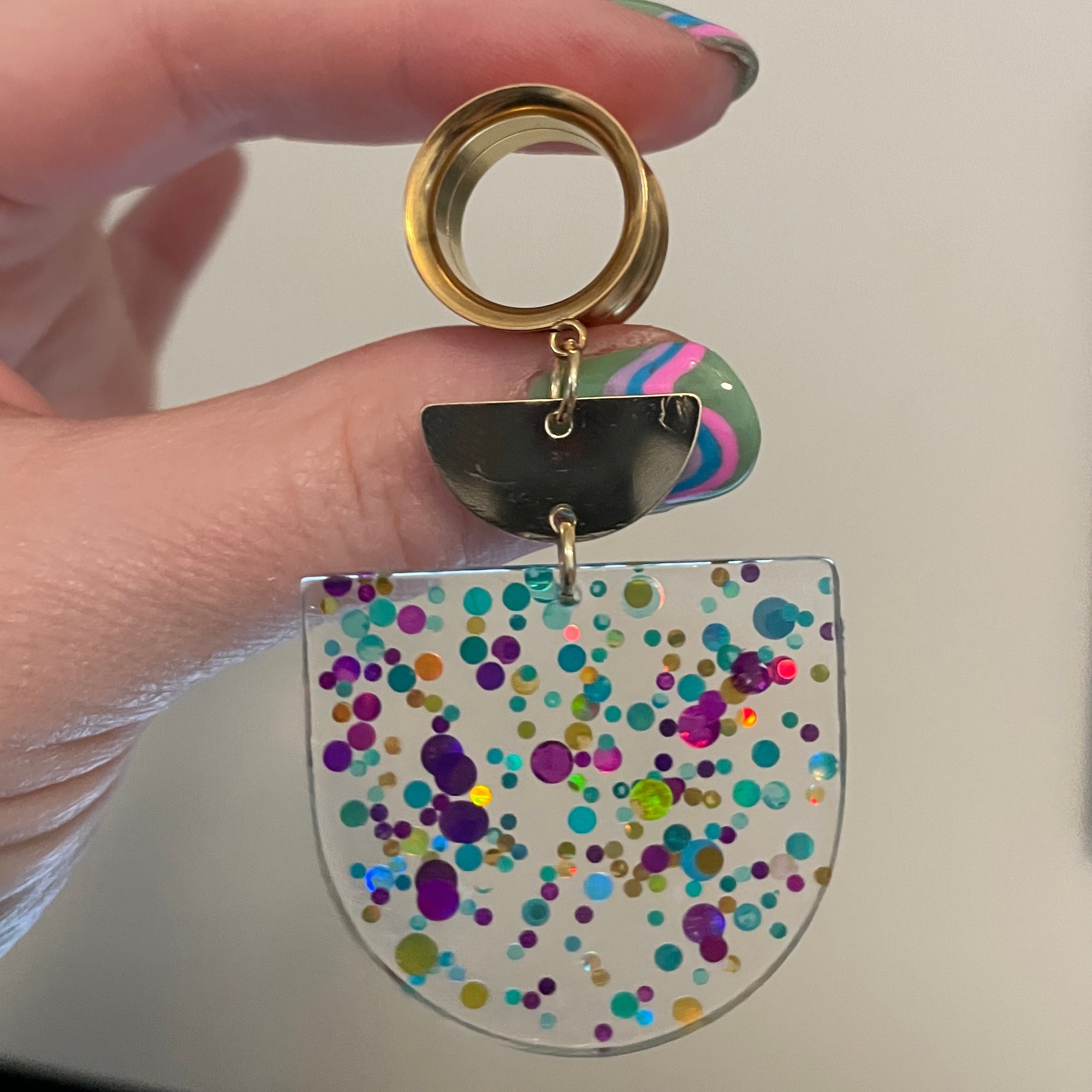 One pair of double flare surgical steel screw back tunnels with this super adorable confetti glitter dangle!