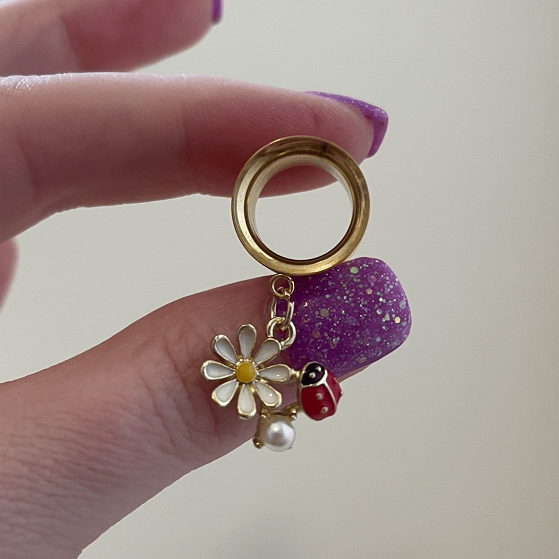 One pair of double flare surgical steel screw back tunnels with this adorable little ladybug/daisy dangle!
