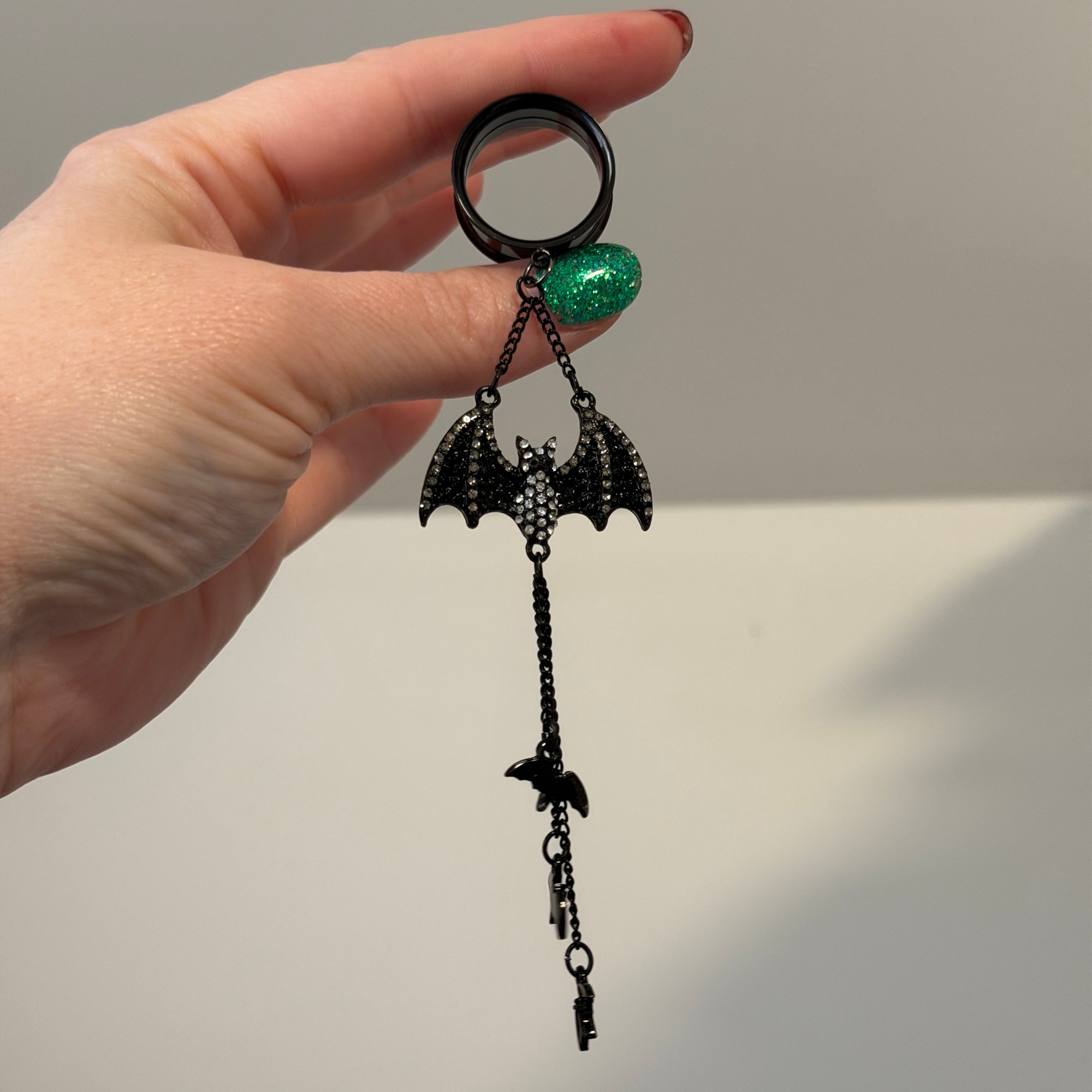 One pair of black surgical steel saddles/tunnels with a silver hoop with this very cute faux diamond bat with three hanging chain bats at the bottom!