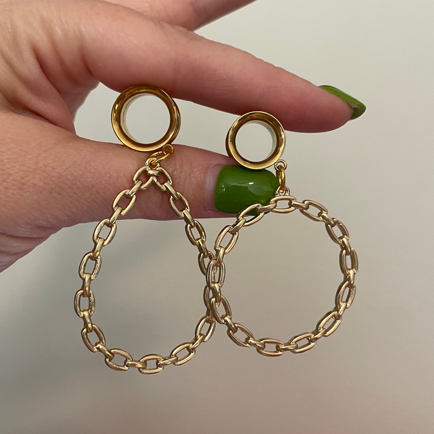 One pair of double flare surgical steel screw back tunnels with these super fun gold chain hoop dangles!