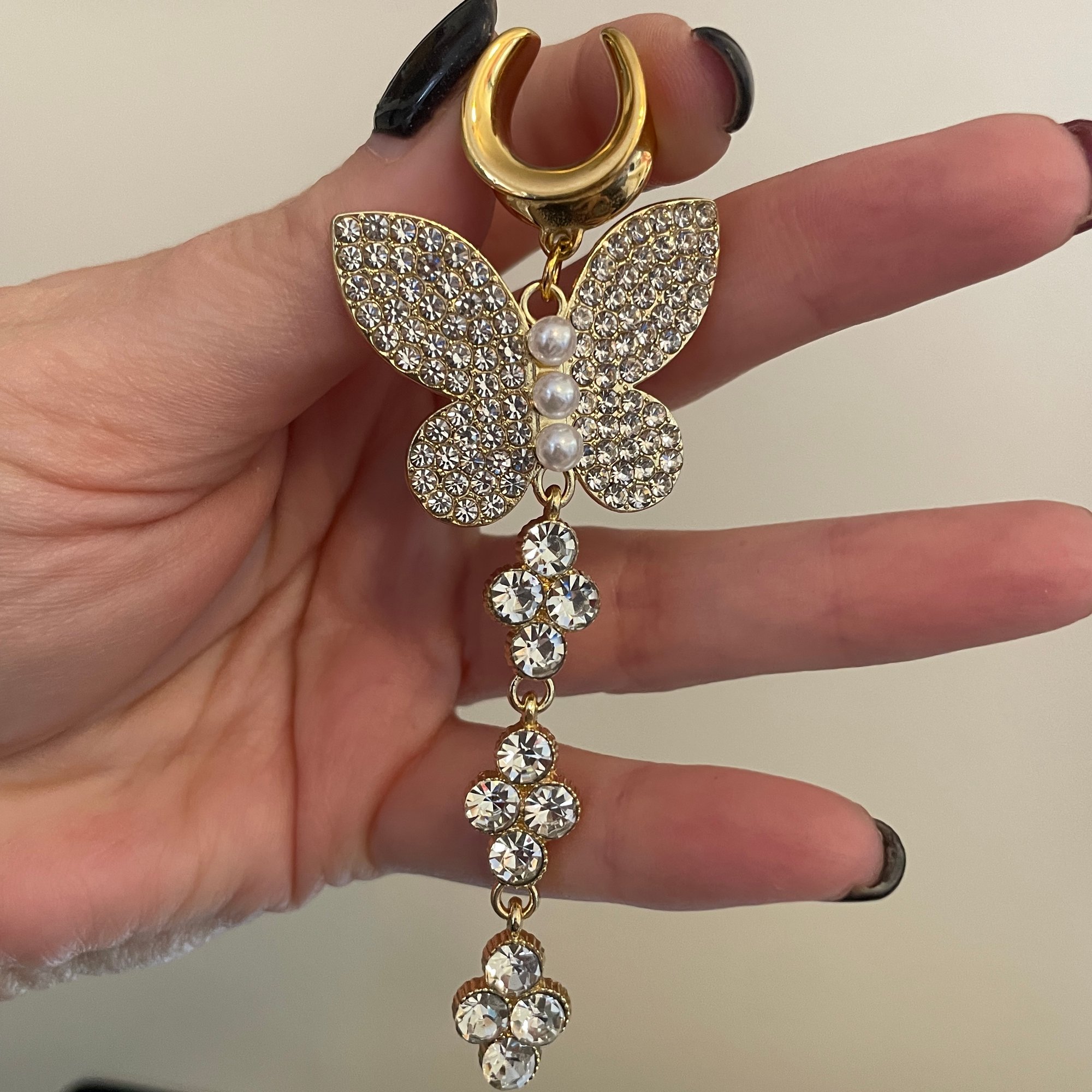 One pair of gold surgical steel saddles with this faux pearl/diamond butterfly design!