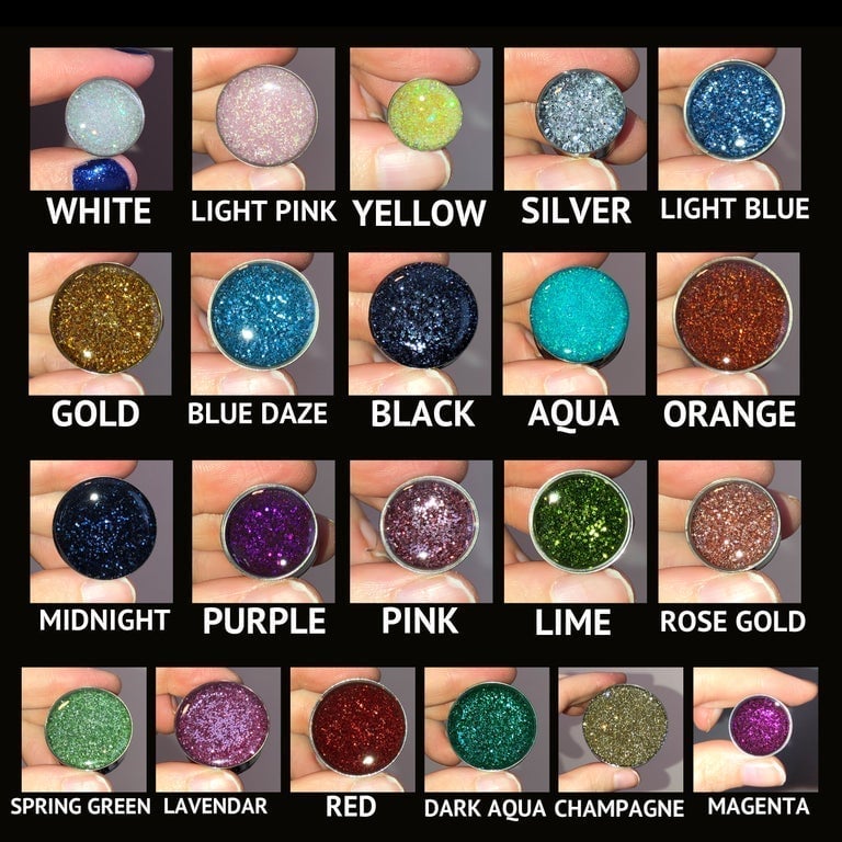 One pair of single flare surgical steel plugs (with o-rings) filled with your choice of glitter (options shown in product photos, first ones are holo, others are basic) and a cute holographic deathly hallow logo on top! In larger sizes there will be multiple! Please note the hallow symbol pops best on lighter colors of glitter!