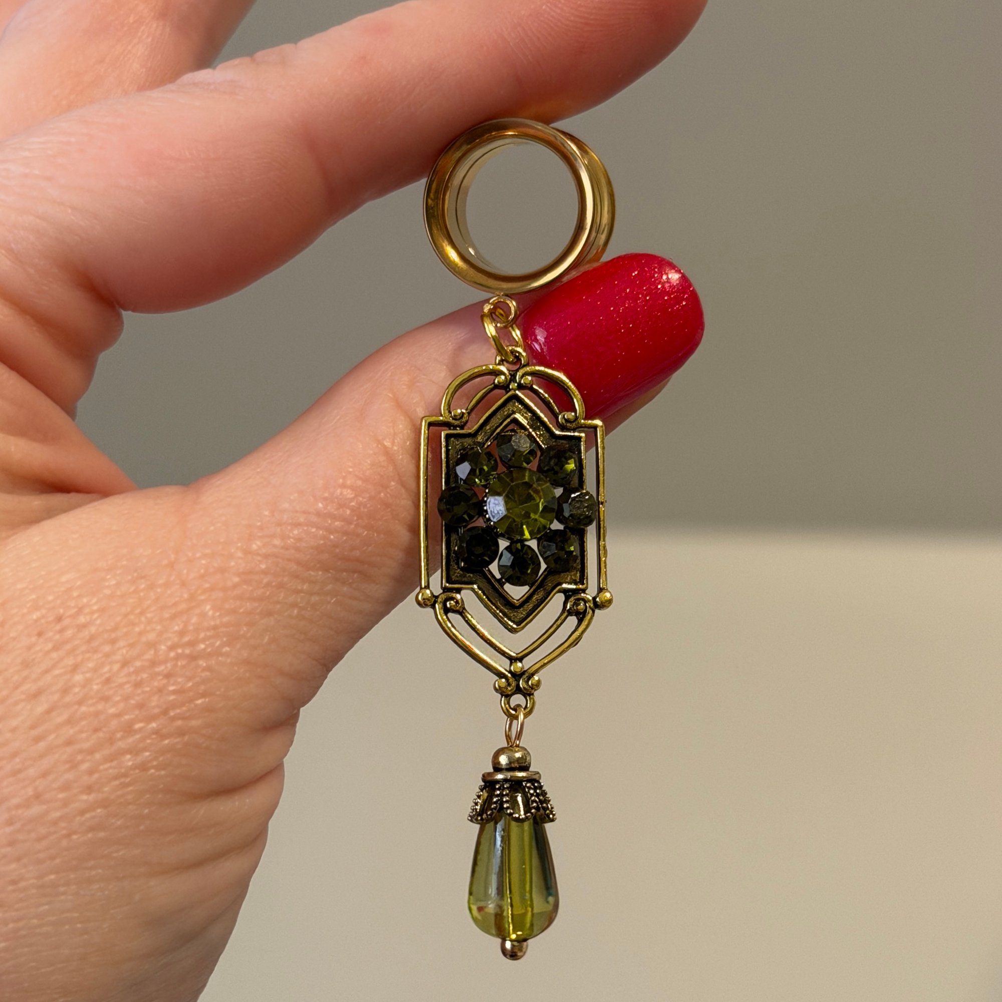 One pair of surgical steel saddles/tunnels with this beautiful moss colored art deco design!