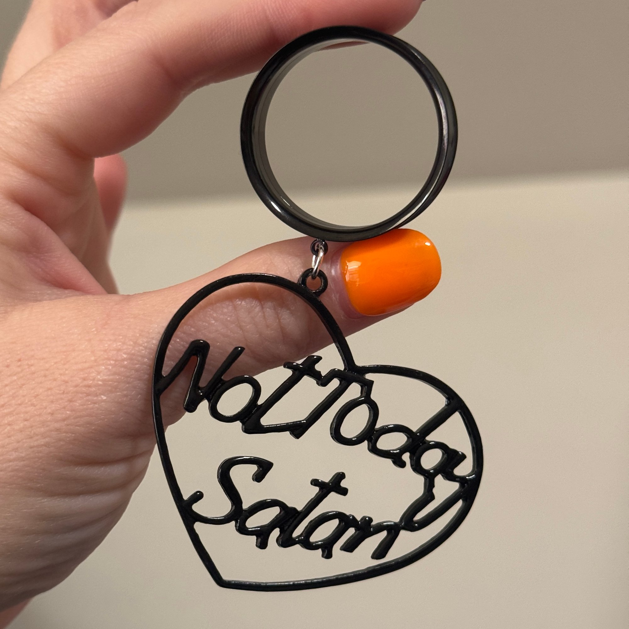 One pair of black surgical steel saddles/tunnels with a silver hoop with this funny "not today satan" dangle!
