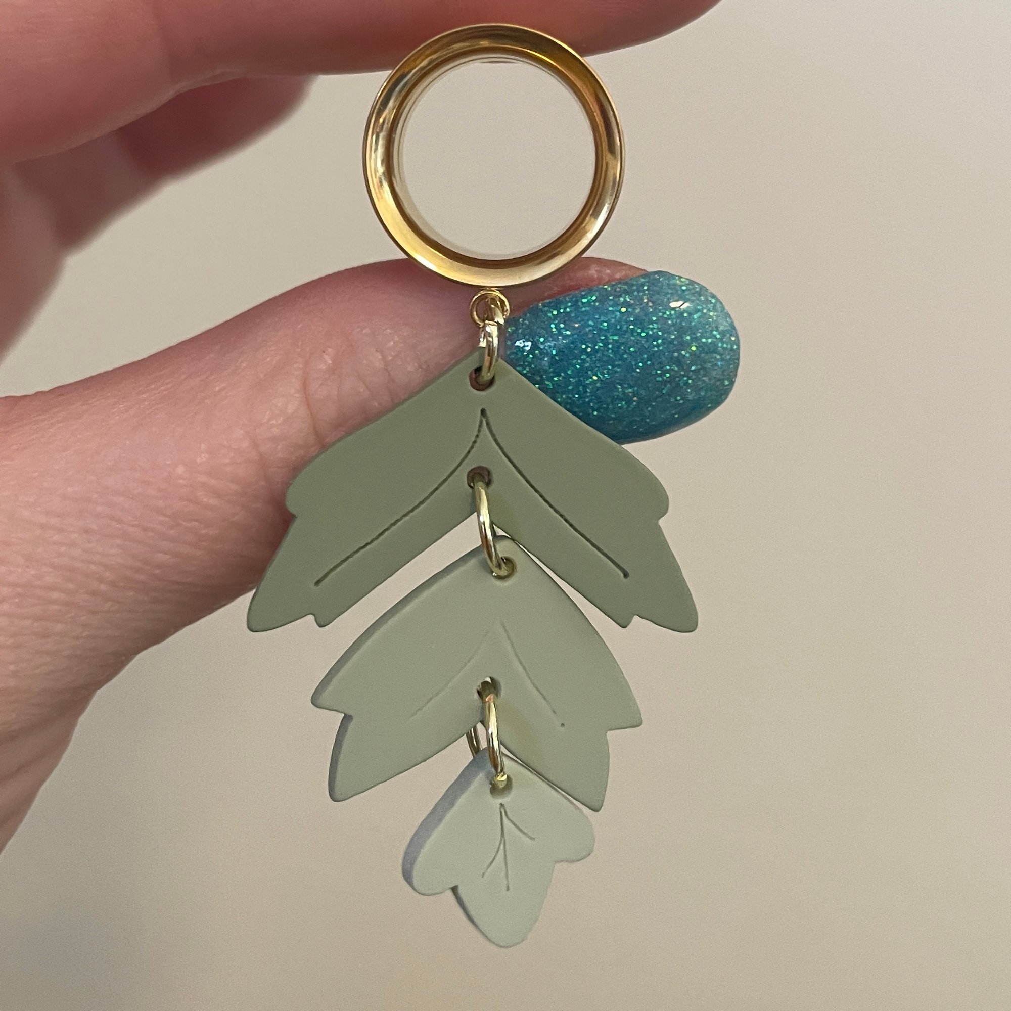 One pair of double flare surgical steel screw back tunnels with this very adorable sagey gradient leaf dangle!