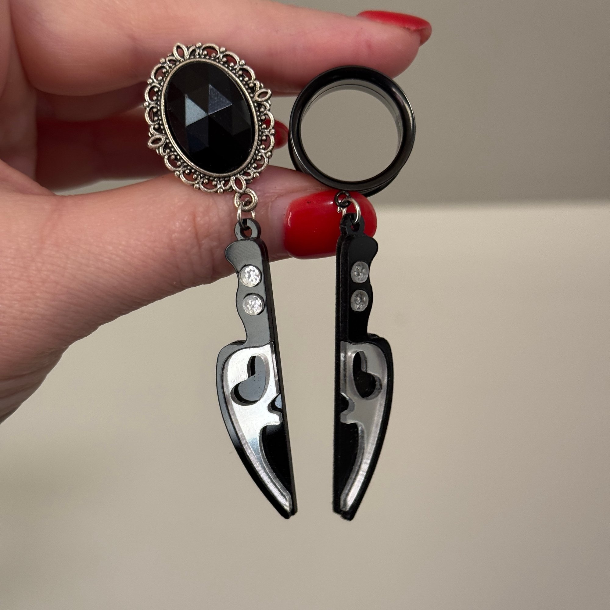 One pair of single flare surgical steel plugs (with o-rings) (gem style) or double flare screw back tunnels with this awesome Ghostface dangle design (they come standard with a black gem but if you'd like another color just contact me). Please note in the sizes 1 1/8-1 1/2 the gem/setting will be round rather than oval. The silver settings may vary slightly by size.