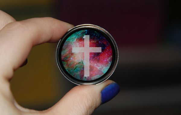 One pair of single flare surgical steel plugs (with o-rings), both featuring this really awesome space/cross design!