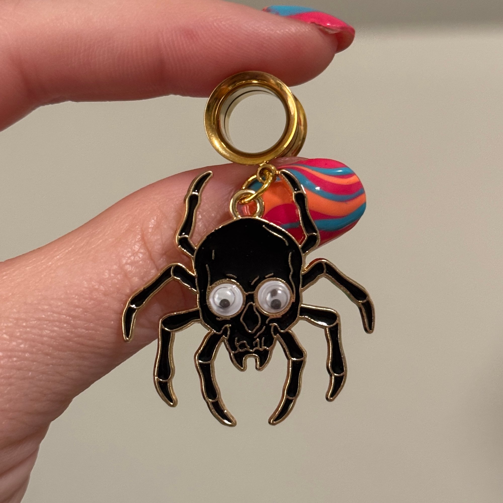 One pair of surgical steel saddles/tunnels with a fun spider dangle with googley eyes!