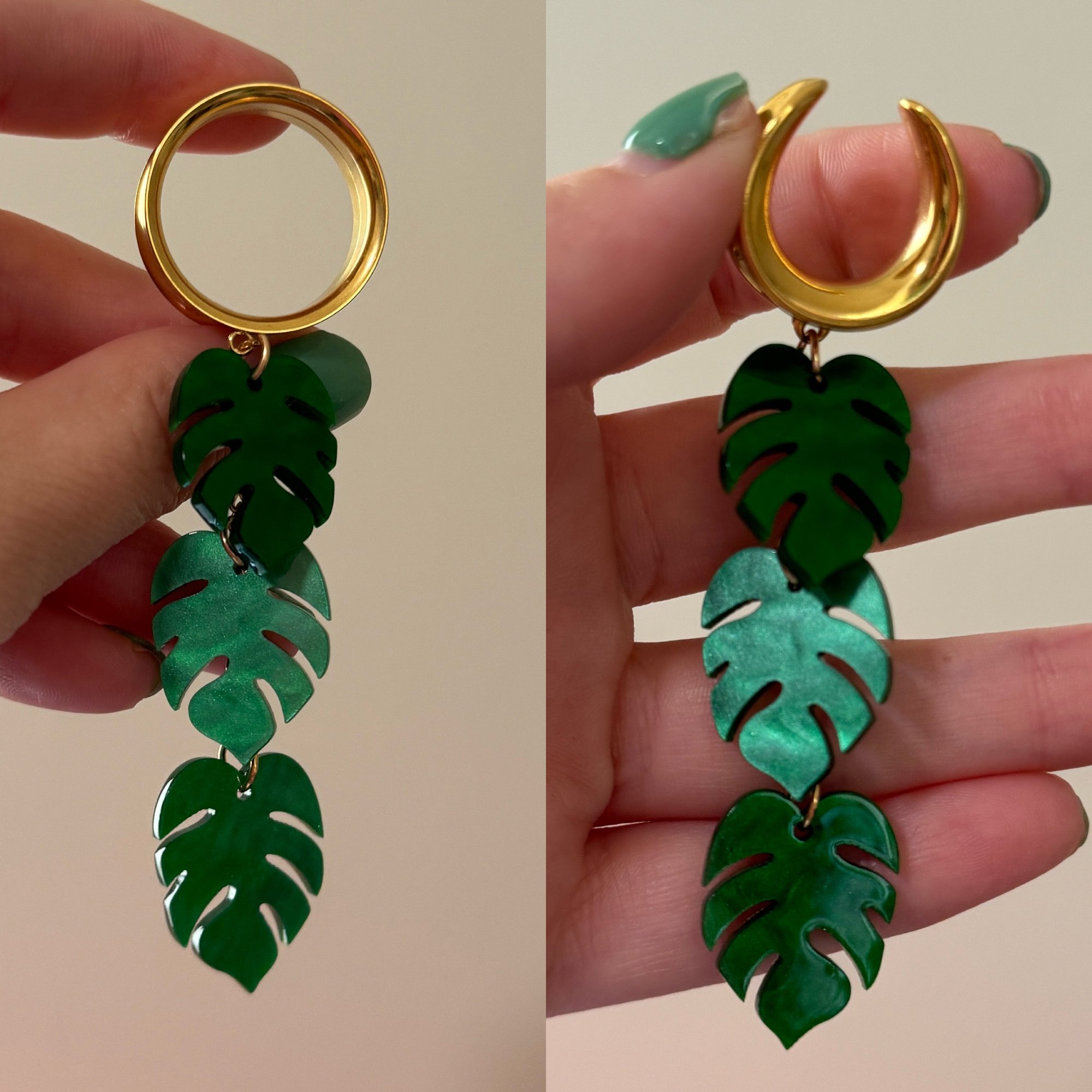 One pair of gold surgical steel saddles/tunnels with a very cute tropical leaf design!