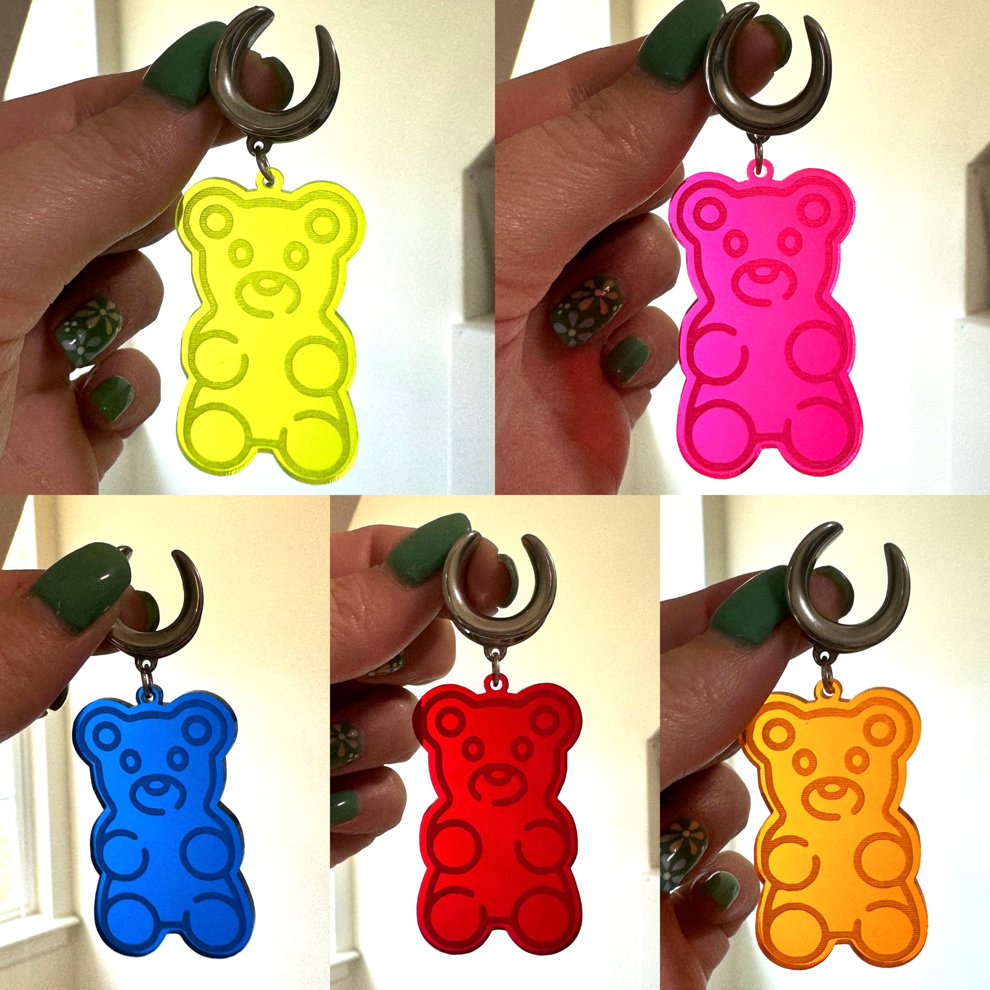 One pair of silver surgical steel saddles with your choice of 5 translucent gummy bear dangles! Please note I can only do pairs of the same color bear at this time.